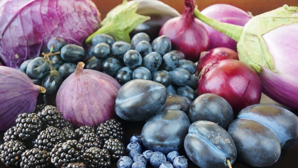 Blue and purple fruits and veggies contain anthocyanins and vitamins and minerals like fiber, manganese, potassium and vitamins B6, C and K1.